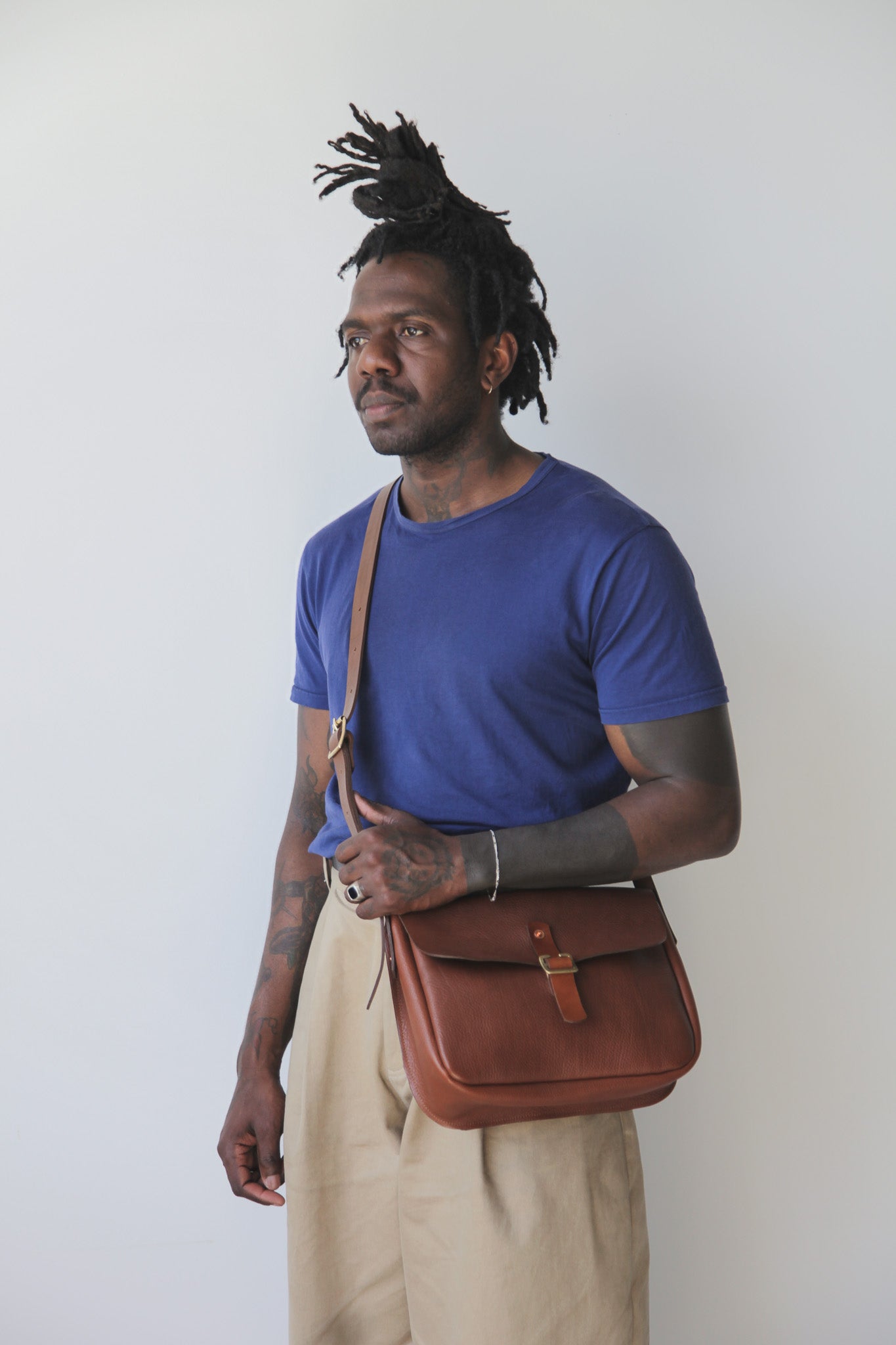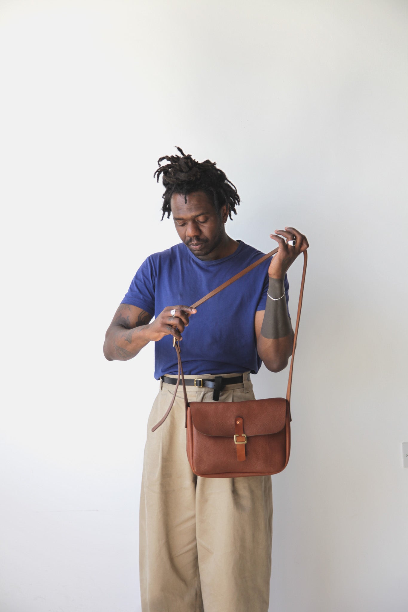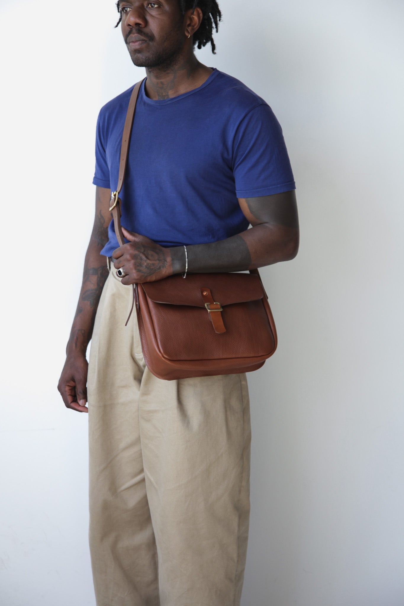 - Adjustable saddle leather strap with brass buckle