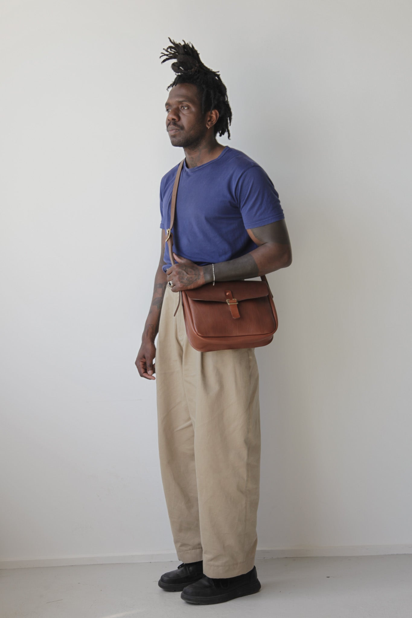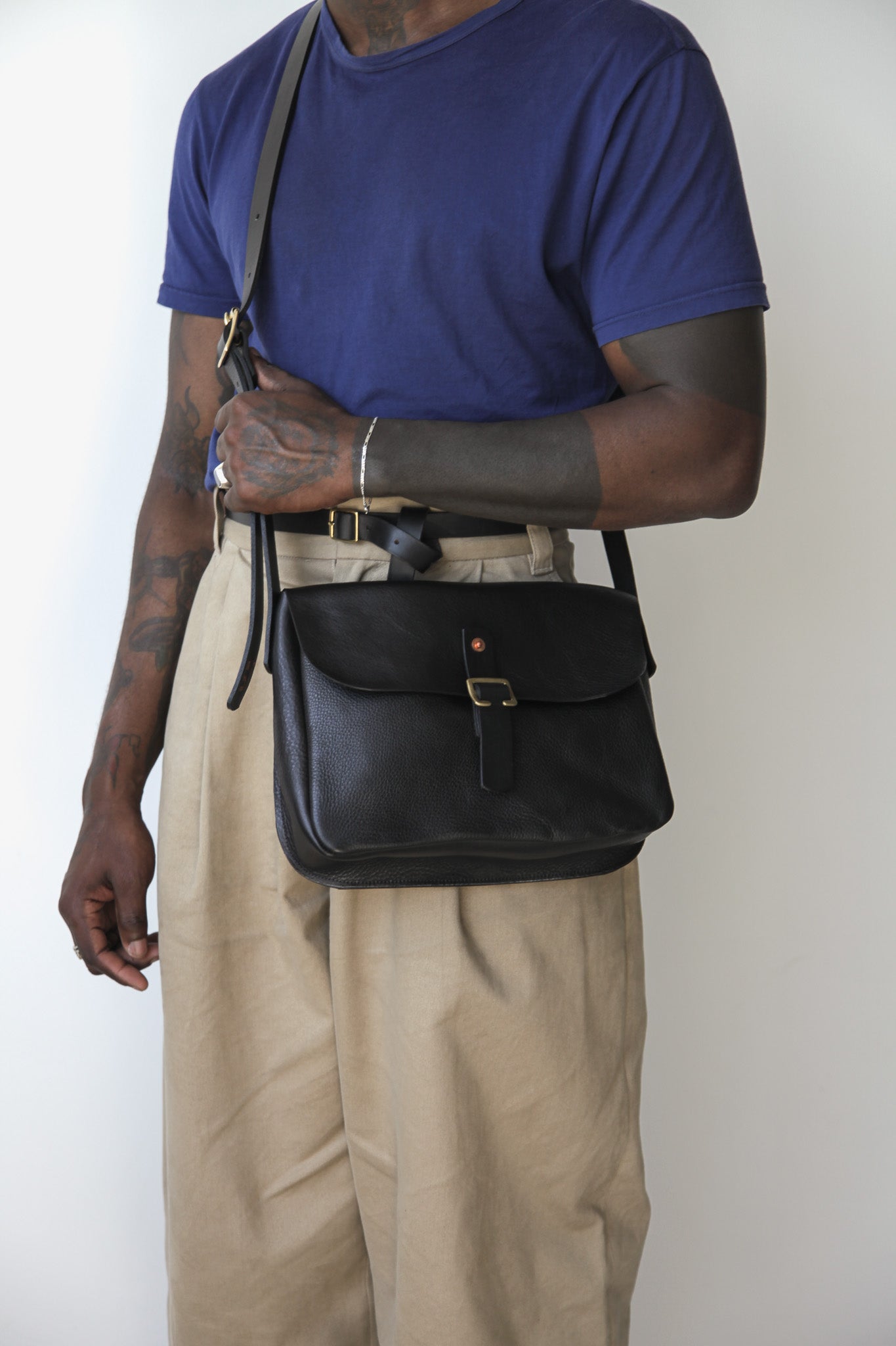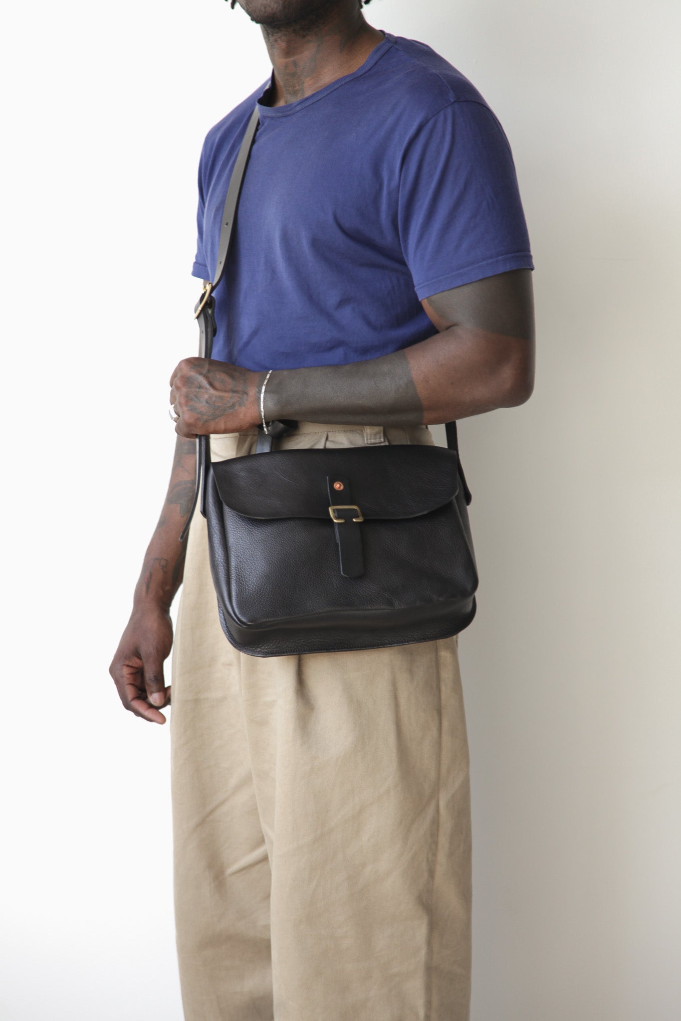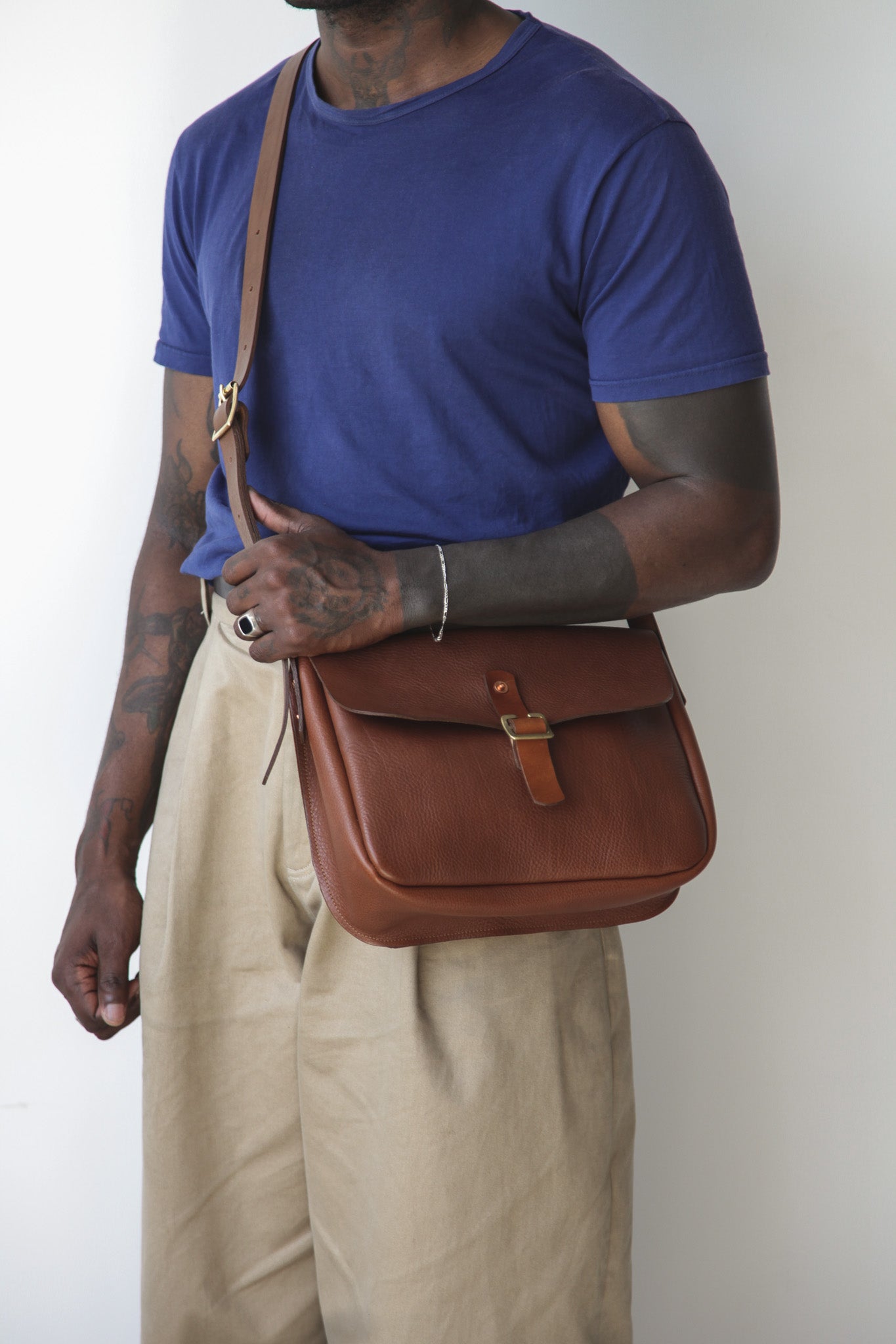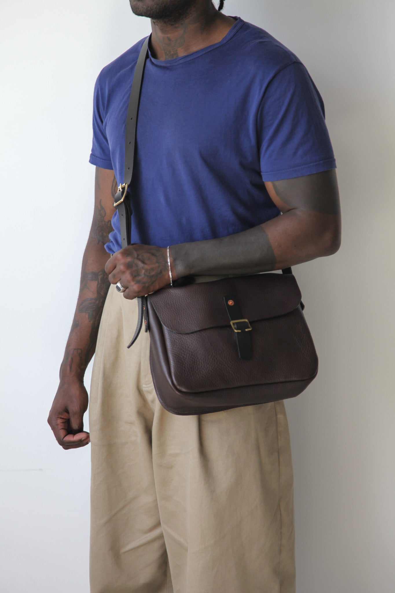 The Foulden features a brass slide tab closure, adjustable leather cross-body strap and brass and copper rivet fittings.