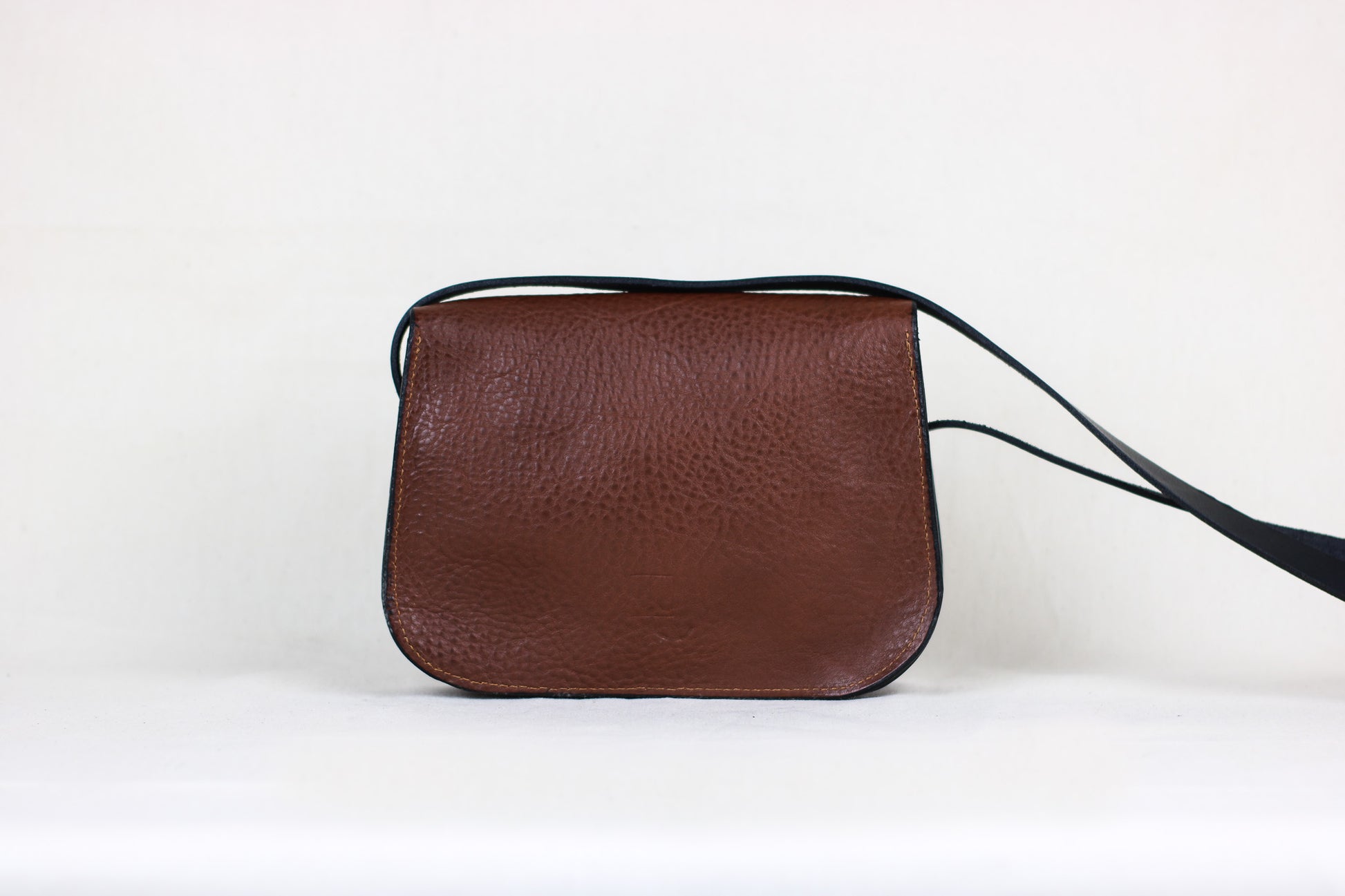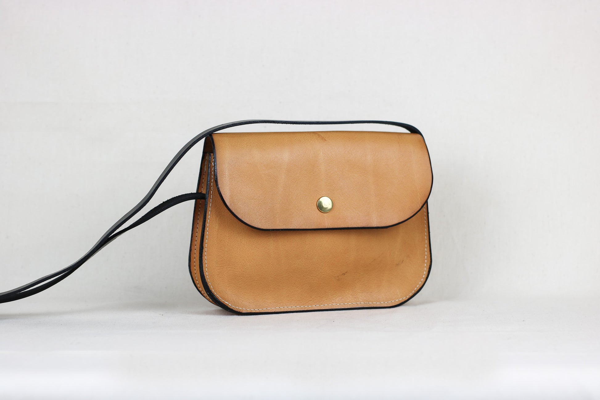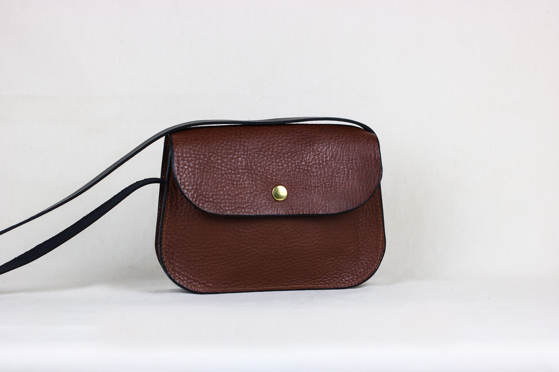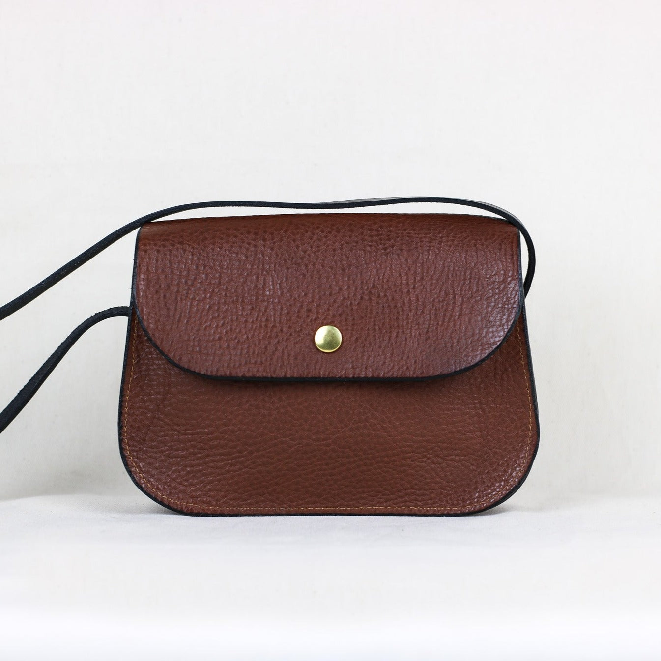 Small saddle leather cross-body bag. The Grace features a front snap closure and an adjustable cross-body strap.