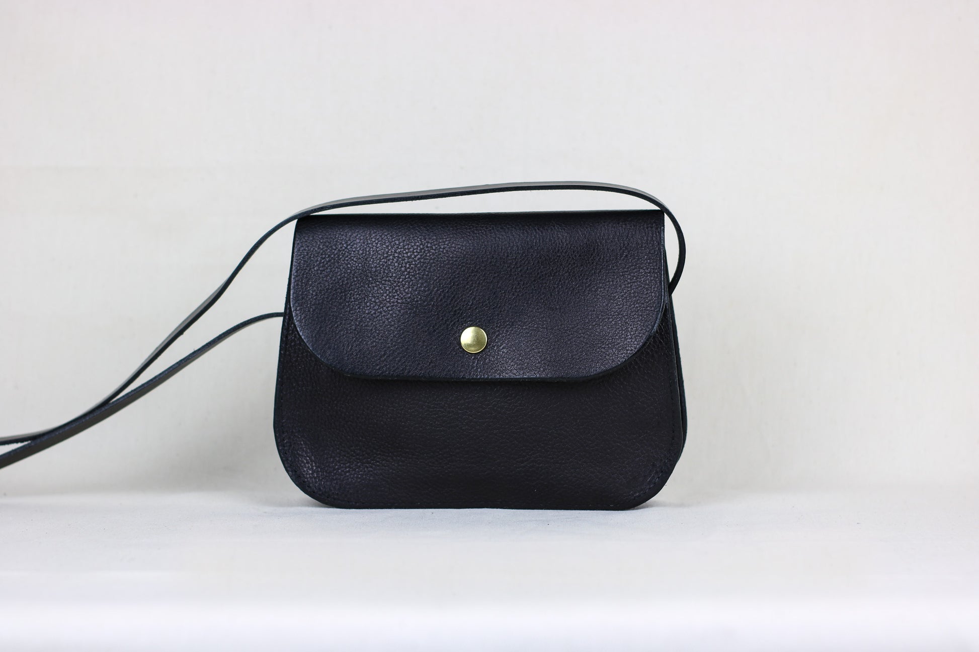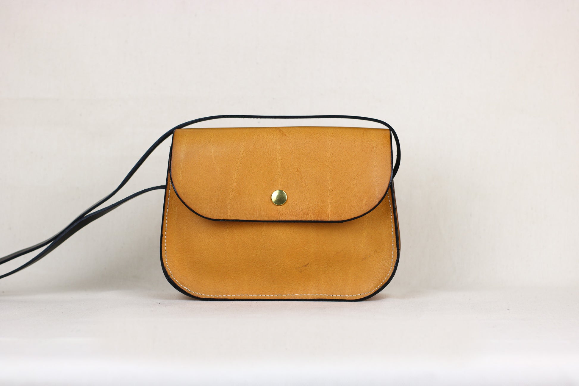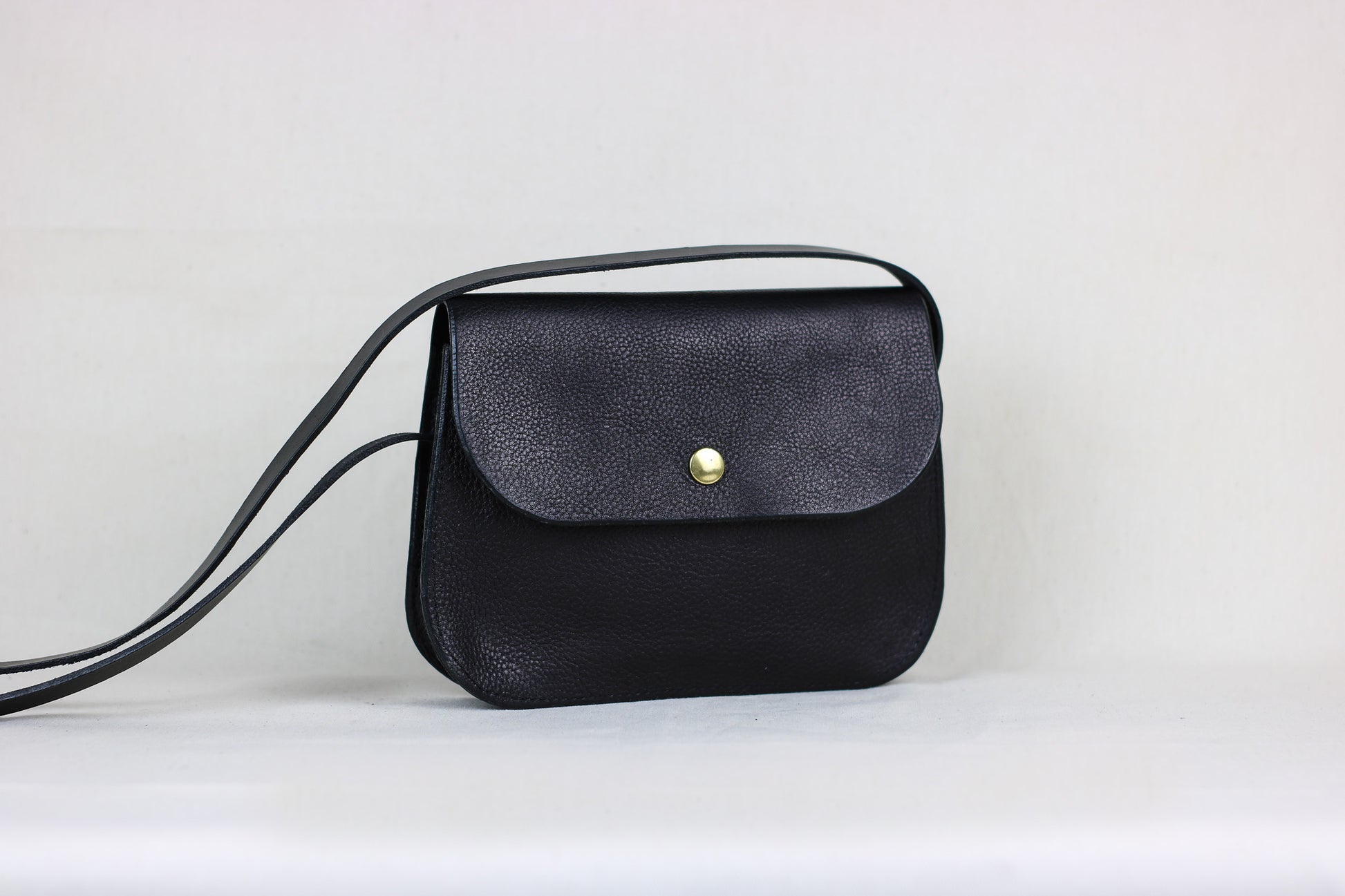 Small saddle leather cross-body bag. The Grace features a front snap closure and an adjustable cross-body strap.