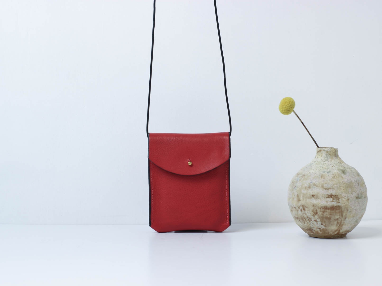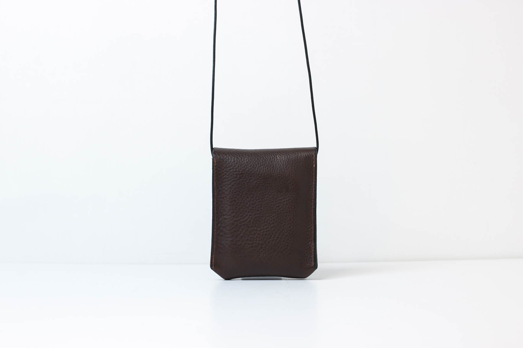 A mini saddle leather pouch bag. Features a brass stud closure closure and a cord cross-body strap.